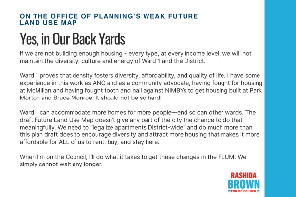 “The draft land use map that came out of Office of Planning is totally insufficient – it barely adds density when we need more affordable housing and for the dense and diverse communities that make small business, transit and everything else about our communities work better.”